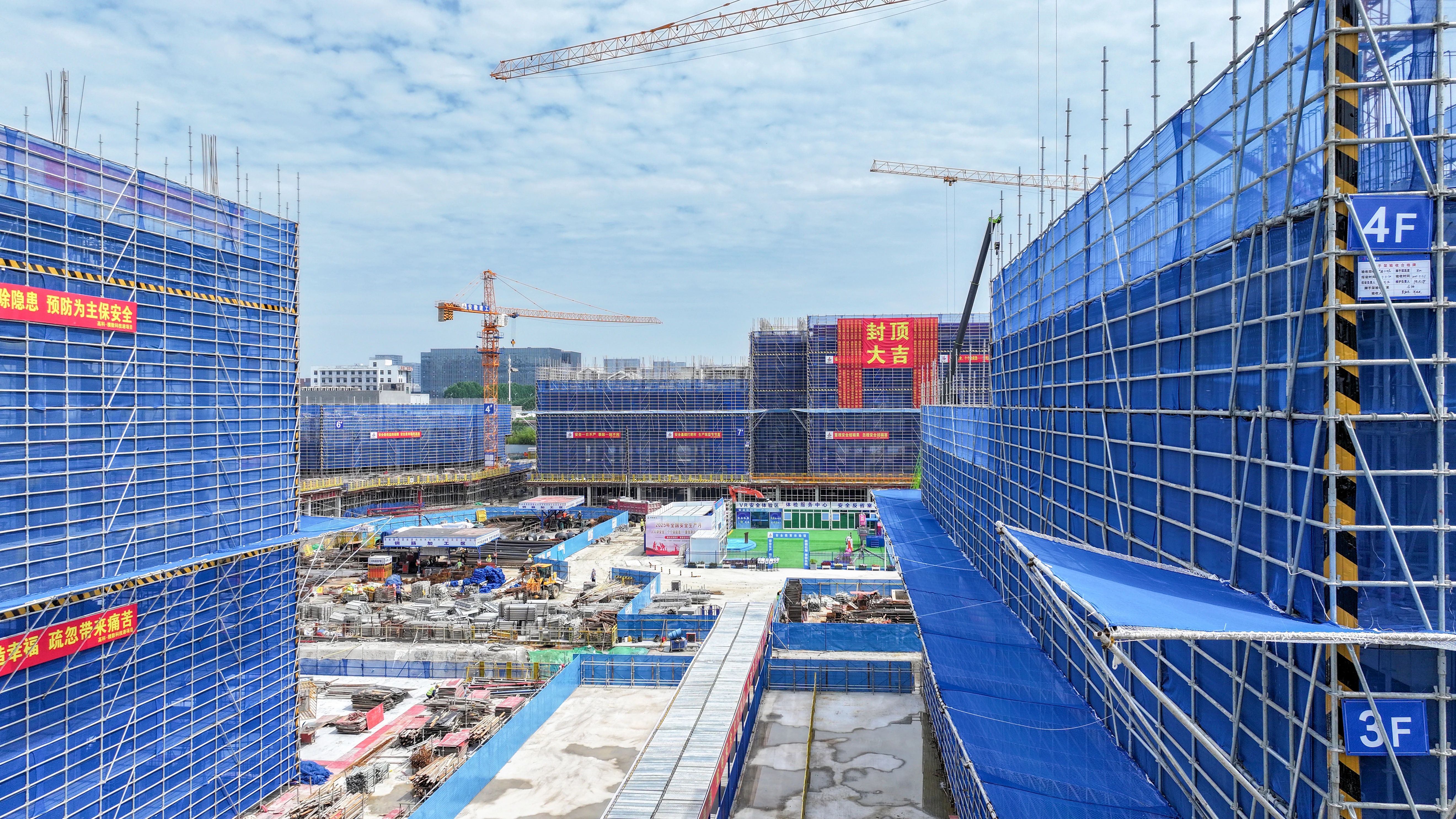 目前,項目2號樓和8號樓已順利完成主體結(jié)構(gòu)封頂,標志著項目建設(shè)取得重要階段性成果。據(jù)了解,面對近期高溫酷暑與梅雨天氣的雙重考驗,項目部科學制定施工方案,采取"錯峰施工+智能監(jiān)測+動態(tài)防護"綜合策略,確保施工安全和進度。通過合理調(diào)整作業(yè)時間,避開高溫時段,保障施工人員身體健康;利用智能監(jiān)測系統(tǒng)實時監(jiān)控施工現(xiàn)場數(shù)據(jù),及時排查安全隱患;根據(jù)天氣變化動態(tài)調(diào)整防護措施和施工計劃,實現(xiàn)了施工安全與工程進度的統(tǒng)籌推進。